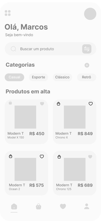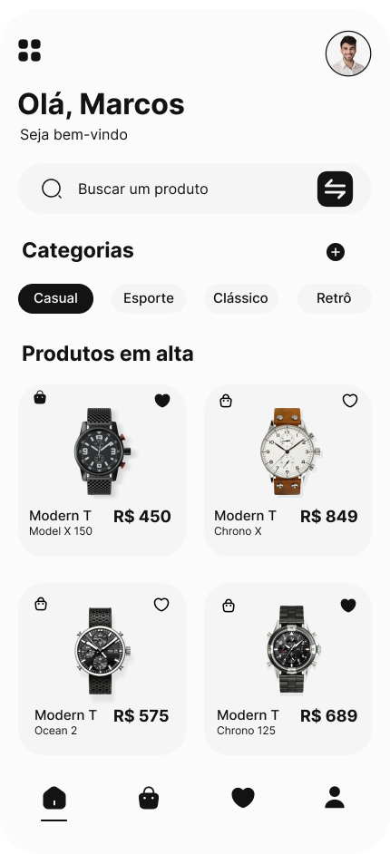 Também implementei a funcionalidade do ícone de coração, que permite marcar itens como favoritos embora a tela correspondente ao menu de favoritos não tenha sido desenvolvida, já que o foco principal estava na experiência de compra rápida e intuitiva.