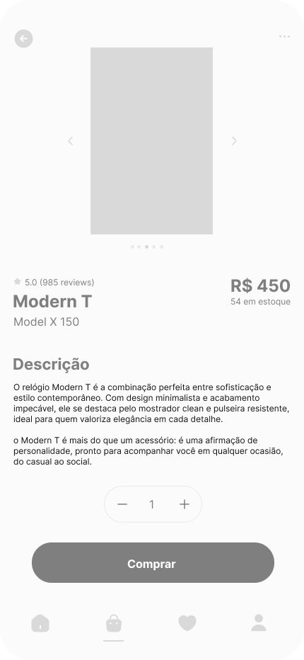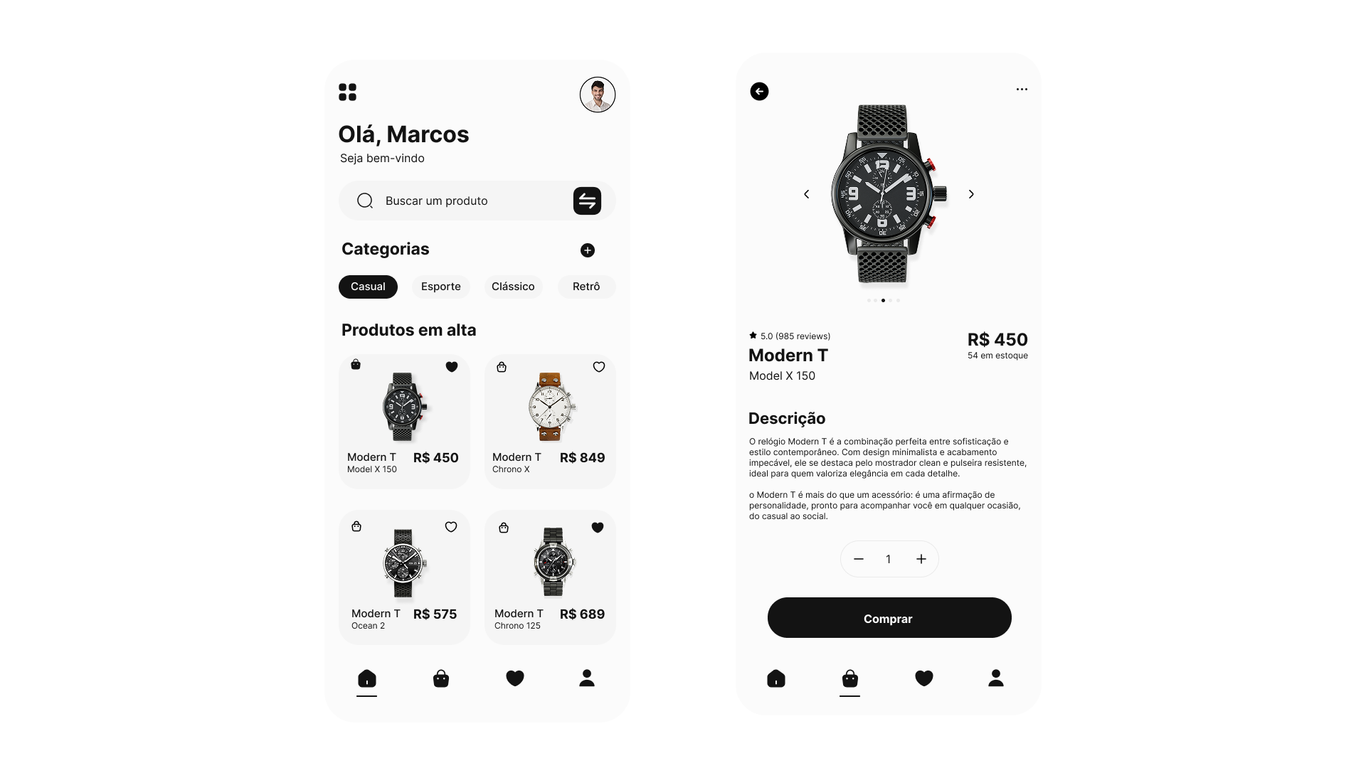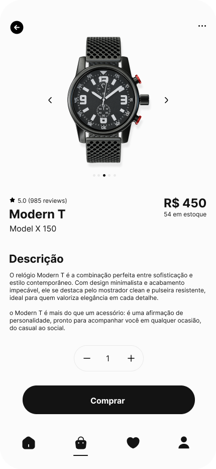 Neste projeto, foquei em aprimorar minhas habilidades em design de interface (UI), com ênfase em criar uma jornada de compra direta e fluida para um relógio em uma interface minimalista.
