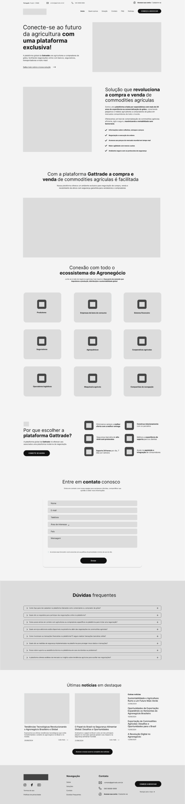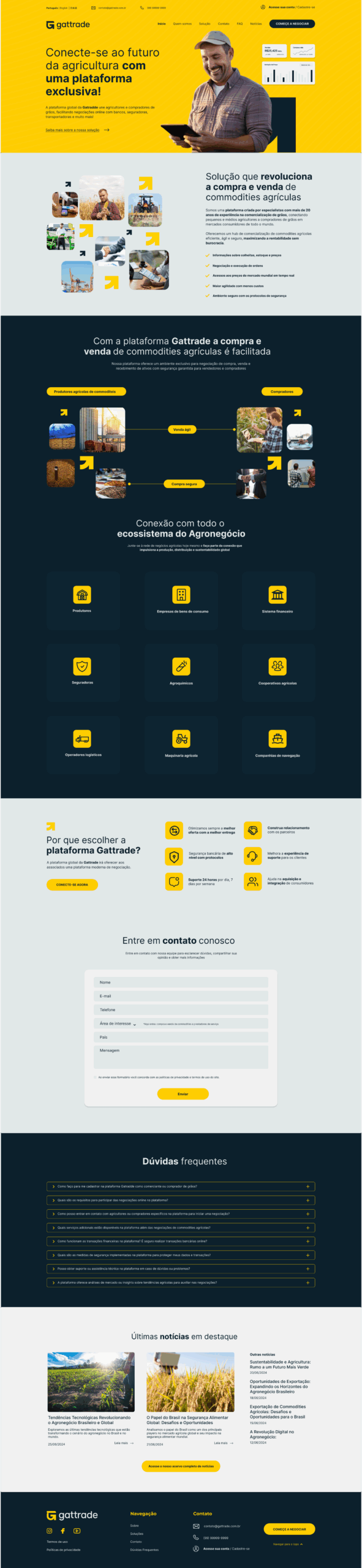 O projeto da Gattrade surgiu dentro de um desafio internacional, com o objetivo de criar um site one page que funcionasse como porta de entrada para o aplicativo da marca. A plataforma atua como um hub de negociação para o agronegócio, conectando produtores rurais, compradores de commodities, instituições financeiras, seguradoras, transportadoras e demais players do setor.
